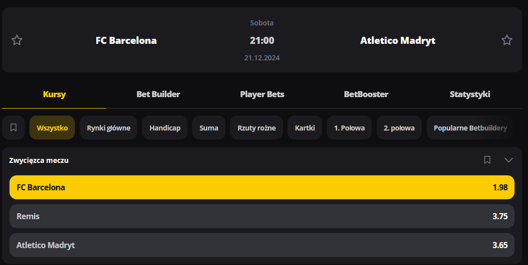 Kursy na mecz Barcelona – Atletico Madryt znajdziesz TUTAJ.