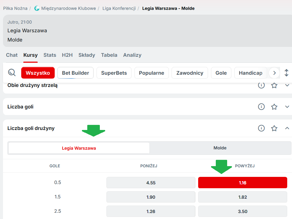 3. Postawić kupon za minimum 2 złote na powyżej 0,5 gola Legii Warszawa w meczu z Molde (patrz: screen poniżej). Zakład musi być pierwszym po założeniu konta, koniecznie singlem, zagranym przed spotkaniem (zakłady live nie będą brane pod uwagę). Kupon musi być zagrany za środki z salda depozytowego (nie za freebet).