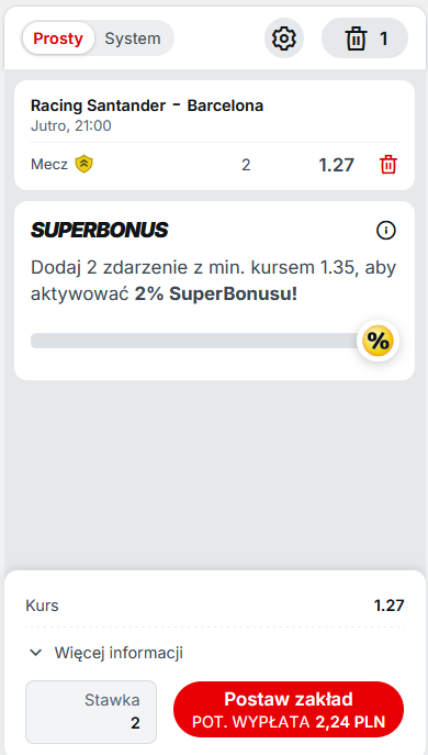 3. Postawić kupon na zwycięstwo Barcelony w wyjazdowym meczu z Racingiem (patrz screen poniżej) za minimum 2 złote. Zakład musi być pierwszym po założeniu konta, koniecznie singlem, zagranym przed spotkaniem (zakłady live nie będą brane pod uwagę). Kupon musi być zagrany za środki z salda depozytowego (nie za freebet).