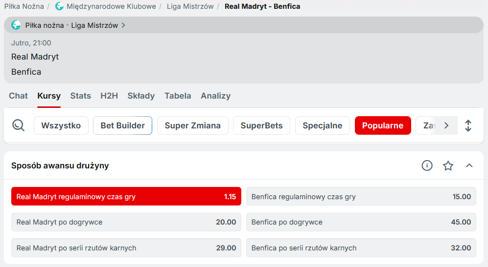 3. Z oferty Superbet na mecz Real Madryt – Benfica wybrać zakład na awans Realu w regulaminowym czasie gry (patrz screen poniżej) i postawić go za minimum 2 złote. Zakład musi być pierwszym po założeniu konta, koniecznie singlem, zagranym przed spotkaniem (zakłady live nie będą brane pod uwagę). Kupon musi być zagrany za środki z salda depozytowego (nie za freebet).
