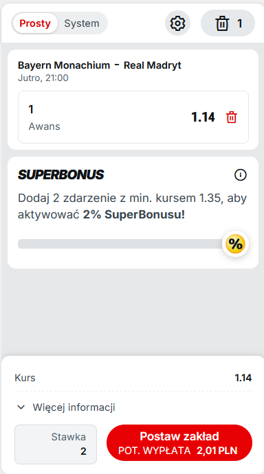 3. Postawić kupon na awans Bayernu Monachium do półfinału Ligi Mistrzów (patrz screen poniżej) za minimum 2 złote. Zakład musi być pierwszym po założeniu konta, koniecznie singlem, zagranym przed spotkaniem (zakłady live nie będą brane pod uwagę). Kupon musi być zagrany za środki z salda depozytowego, nie za freebet.