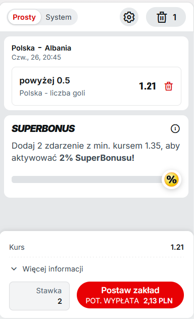 3. Postawić kupon na powyżej 0,5 gola Polski w meczu z Albanią (patrz screen poniżej) za minimum 2 złote. Zakład musi być pierwszym po założeniu konta, koniecznie singlem, zagranym przed spotkaniem (zakłady live nie będą brane pod uwagę). Kupon musi być zagrany za środki z salda depozytowego (nie za freebet).
