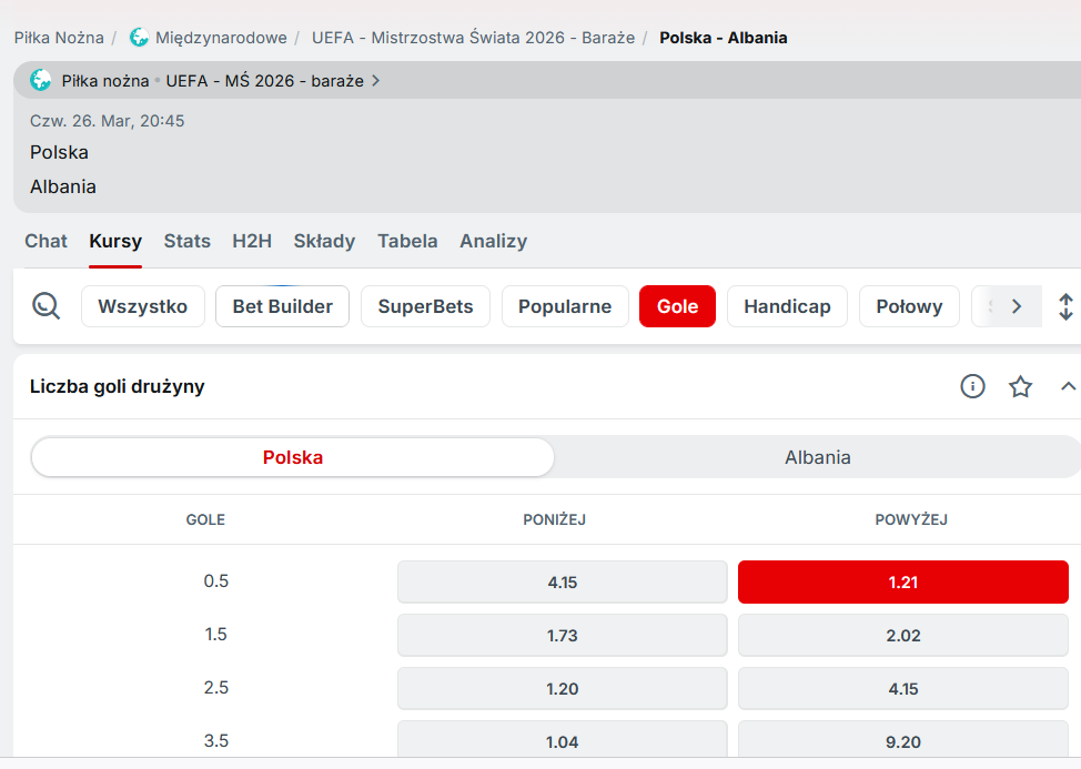 Zakład na minimum jednego gola Polski w meczu z Albanią najszybciej znajdziesz w TUTAJ w kategorii Gole -> Liczba goli drużyny -> Polska.