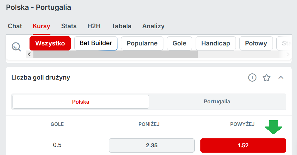 3. Postawić kupon na gola Polski z Portugalią (typ zakładu: Liczba goli drużyny -> Polska -> powyżej 0.5; patrz screen poniżej) za minimum 2 złote. Zakład musi być pierwszym po założeniu konta, koniecznie singlem, zagranym przed spotkaniem (zakłady live nie będą brane pod uwagę). Kupon musi być zagrany za środki z salda depozytowego (nie za freebet).