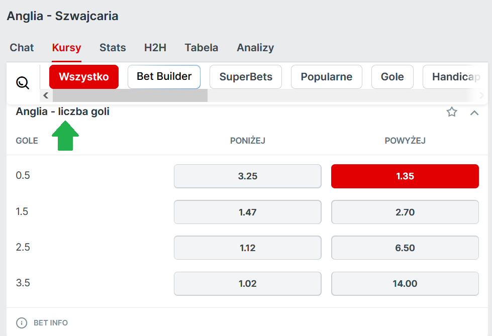 Kurs na gola Anglii wynosi obecnie 1.35 (screen powyżej), na gola Szwajcarii – 1.60.