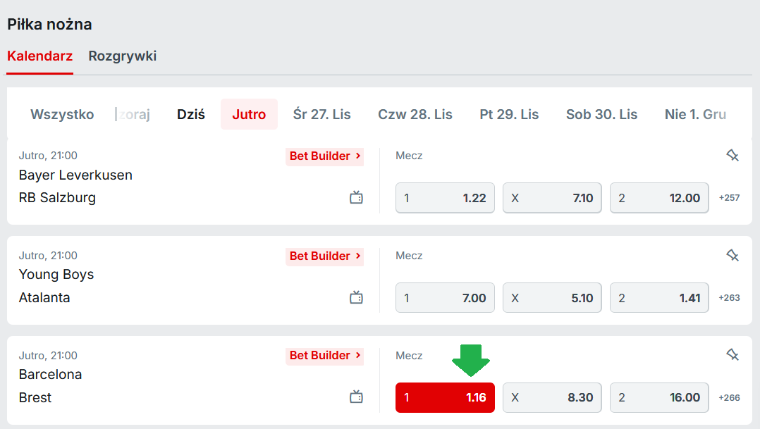 3. Postawić kupon na wygraną Barcelony z Brest (typ zakładu: Mecz -> 1; patrz screen poniżej) za minimum 2 złote. Zakład musi być pierwszym po założeniu konta, koniecznie singlem, zagranym przed spotkaniem (zakłady live nie będą brane pod uwagę). Kupon musi być zagrany za środki z salda depozytowego (nie za freebet).