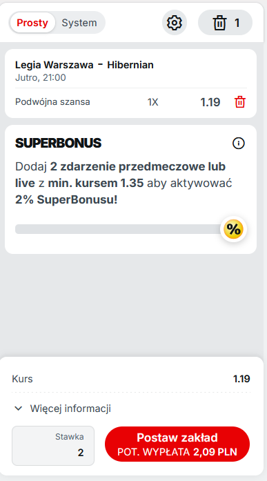 3. Postawić kupon na wygraną lub remis Legii w meczu z Hibernian (typ zakładu: Podwójna szansa -> 1X; patrz screen poniżej) za minimum 2 złote. Zakład musi być pierwszym po założeniu konta, koniecznie singlem, zagranym przed spotkaniem (zakłady live nie będą brane pod uwagę). Kupon musi być zagrany za środki z salda depozytowego (nie za freebet).