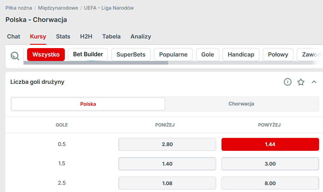 3. Postawić kupon na gola Polski z Chorwacją (typ zakładu: Liczba goli drużyny -> Polska -> powyżej 0.5; patrz screen poniżej) za minimum 2 złote. Zakład musi być pierwszym po założeniu konta, koniecznie singlem, zagranym przed spotkaniem (zakłady live nie będą brane pod uwagę). Kupon musi być zagrany za środki z salda depozytowego (nie za freebet).