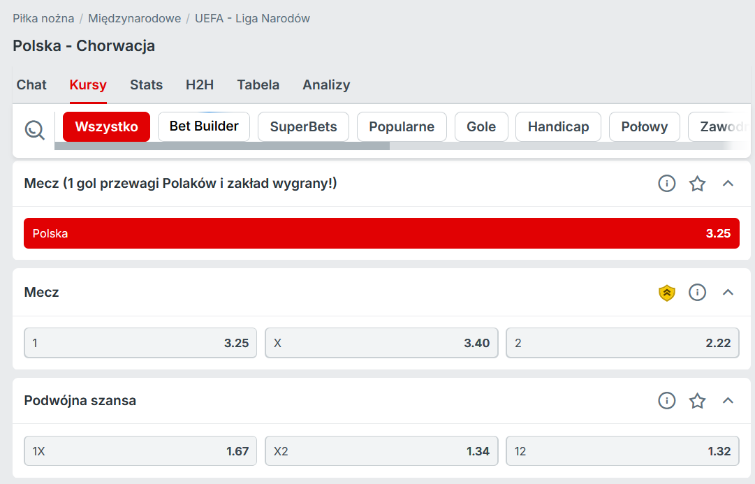 Jeśli w dowolnym momencie meczu Polska obejmie prowadzenie (np: 1:0, 2:1, 3:2), w Superbet zakłady na jej wygraną zostaną rozliczone na plus – nawet jeśli ostatecznie zremisuje lub przegra!
