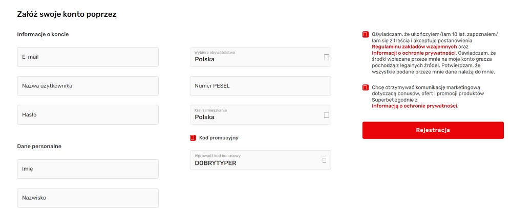 Rejestrując się w Superbet z kodem promocyjnym DOBRYTYPER (można zrobić to TUTAJ), masz pewność, że na Twoje konto gracza wpadnie również freebet w wysokości 35 złotych. Freebet zostanie dodany na konto do 48 godzin po wpłacie pierwszego depozytu (nie może być on niższy niż 50 złotych). Ważne: gracz ma 3 dni na wykorzystanie tego freebetu, a przy rejestracji musi zaznaczyć zgody marketingowe.