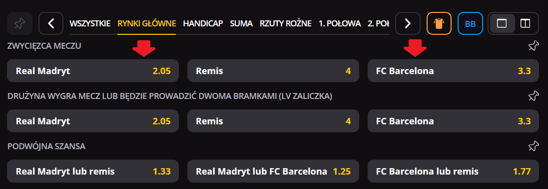 3. Postawić dokładnie 1 złoty na wygraną Realu Madryt lub na wygraną Barcelony po kursie w standardowej ofercie (patrz screen poniżej).