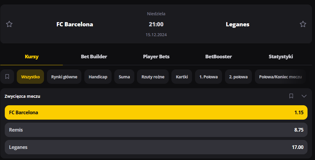 3. Postawić dokładnie 1 złoty na wygraną Barcelony z Leganes po kursie w standardowej ofercie (aktualnie wynosi on 1.15; patrz screen poniżej).