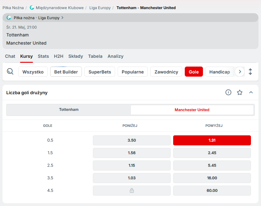 W tegorocznym finale Ligi Europy spotkają się 16. w tabeli Premier League Manchester United oraz 17. Tottenham Hotspur. Dla obu drużyn to ostatnia szansa na uratowanie sezonu. W Superbet znajdziemy ciekawą promocję na środowe spotkanie: bukmacher zapłaci nowym graczom za gola wybranej drużyny. I to aż 400 złotych!