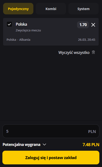 3. Postawić dokładnie 1 złoty na wygraną Polski z Albanią po kursie w standardowej ofercie (aktualnie wynosi on 1.70; patrz screen poniżej).