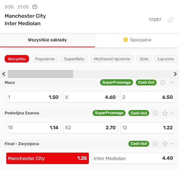 3. Postawić na wygranie Ligi Mistrzów przez Manchester City (typ zakładu: Finał – Zwycięzca; patrz screen poniżej). Zakład musi być pierwszym po założeniu konta, koniecznie singlem, zagranym przed spotkaniem (zakłady live nie będą brane pod uwagę). Minimalna stawka wynosi 2 złote.