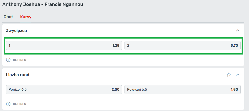 3. Postawić na wygraną Anthony’ego Joshuy lub Francisa Ngannou (typ zakładu: Zwycięzca – 1 lub Zwycięzca – 2; patrz screen poniżej) za minimum 2 złote. Zakład musi być pierwszym po założeniu konta, koniecznie singlem, zagranym przed spotkaniem (zakłady live nie będą brane pod uwagę). Kupon musi być zagrany za środki z salda depozytowego (nie za bonus).