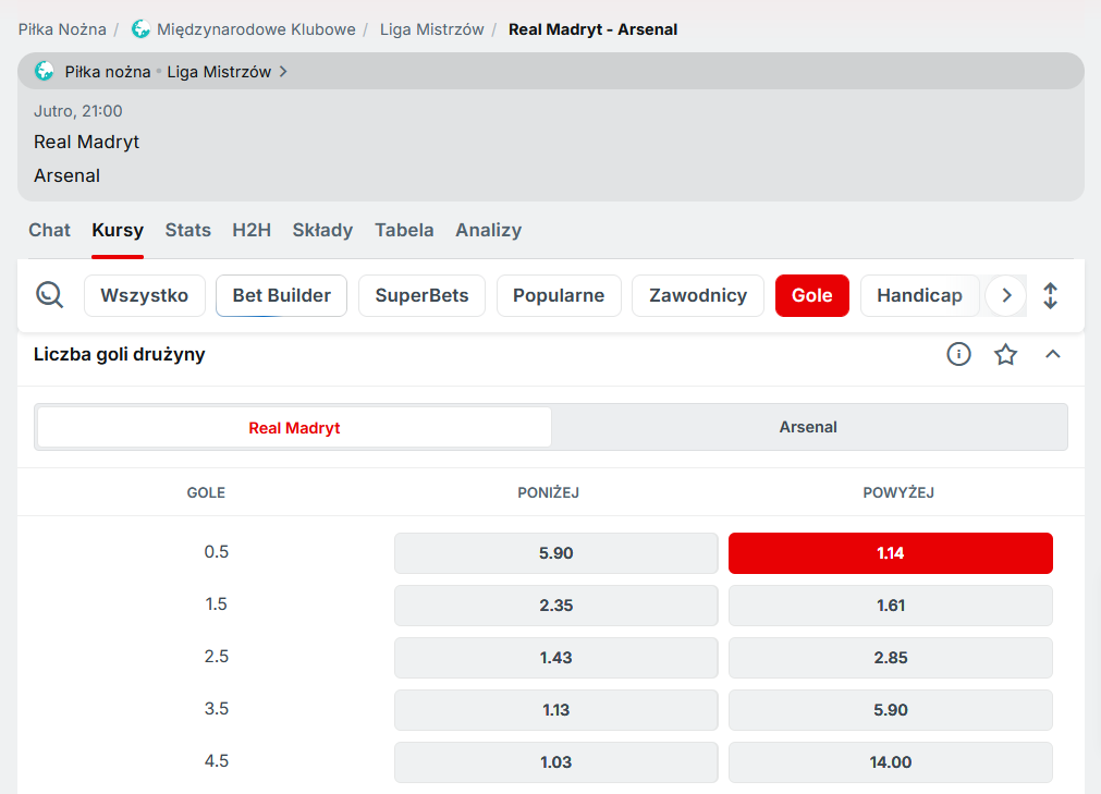3. Postawić kupon na powyżej 0,5 goli Realu Madryt w meczu z Arsenalem (rynek: Liczba goli drużyny – Real Madryt; patrz screen poniżej) za minimum 2 złote. Zakład musi być pierwszym po założeniu konta, koniecznie singlem, zagranym przed spotkaniem (zakłady live nie będą brane pod uwagę). Kupon musi być zagrany za środki z salda depozytowego (nie za freebet).