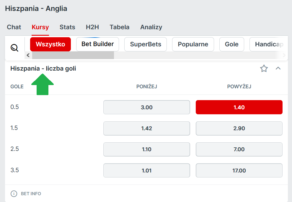 3. Postawić kupon na gola Anglii przeciwko Hiszpanii lub Hiszpanii przeciwko Anglii (zakład: Anglia / Hiszpania liczba goli – powyżej 0,5; patrz screen poniżej) minimum 2 złote. Zakład musi być pierwszym po założeniu konta, koniecznie singlem, zagranym przed spotkaniem (zakłady live nie będą brane pod uwagę). Kupon musi być zagrany za środki z salda depozytowego (nie za freebet).