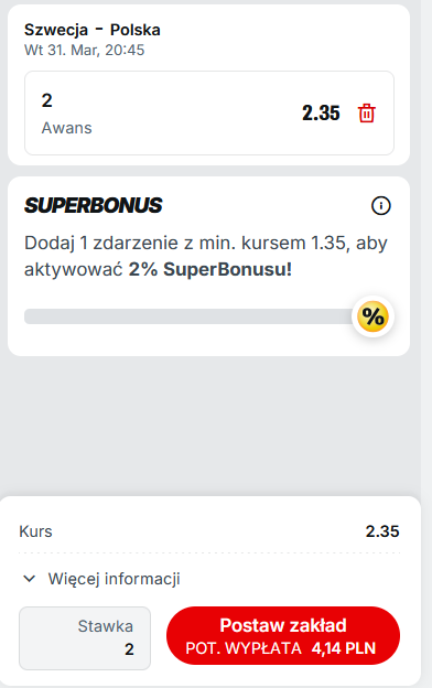 3. Wybrać z oferty na mecz Szwecja – Polska zakład na awans Polski i postawić na niego minimum 2 złote (patrz screen poniżej). Zakład musi być pierwszym po założeniu konta, koniecznie singlem, zagranym przed spotkaniem (zakłady live nie będą brane pod uwagę). Kupon musi być zagrany za środki z salda depozytowego (nie za freebet).