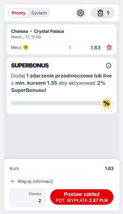 3. Postawić kupon na wygraną dowolnej drużyny w 1. kolejce Premier League (np. Manchesteru City z Wolverhampton czy Chelsea z Crystal Palace) za minimum 2 złote. Zakład musi być pierwszym po założeniu konta, koniecznie singlem, zagranym przed spotkaniem (zakłady live nie będą brane pod uwagę). Kupon musi być zagrany za środki z salda depozytowego (nie za freebet). Przykładowy kupon znajdziesz poniżej.
