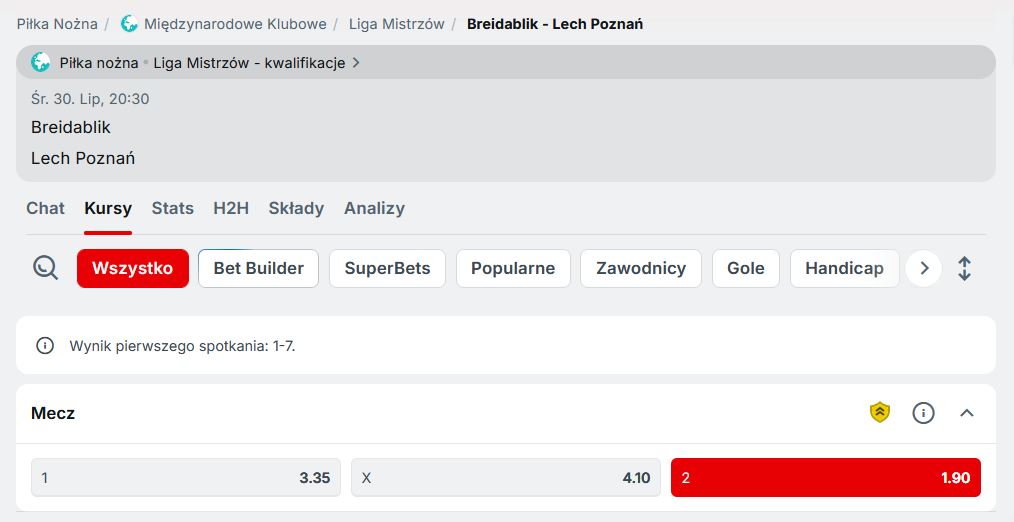 3. Postawić kupon na wygraną Lecha z Breidablik (typ zakładu: Mecz -> 2; patrz screen poniżej) za minimum 2 złote. Zakład musi być pierwszym po założeniu konta, koniecznie singlem, zagranym przed spotkaniem (zakłady live nie będą brane pod uwagę). Kupon musi być zagrany za środki z salda depozytowego (nie za freebet).