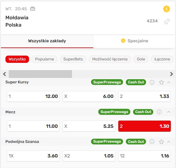 3. Postawić na wygraną Polski z Mołdawią po kursie w standardowej ofercie (obecnie kurs wynosi 1.30). Typ zakładu to Mecz – 2 (patrz screen poniżej). Zakład musi być pierwszym po założeniu konta, koniecznie singlem, zagranym przed spotkaniem (zakłady live nie będą brane pod uwagę). Minimalna stawka wynosi 2 złote.