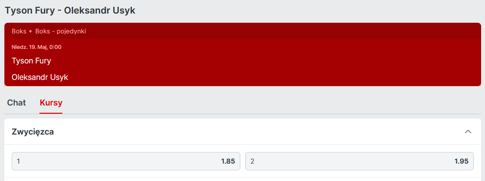 35-letni Fury do niedawna wydawał się dosyć wyraźnym faworytem starcia z Ukraińcem, ale wobec fatalnej dyspozycji w ostatniej walce (minimalnie wygrał z debiutantem Francisem Ngannou, będąc nawet liczonym), kursy bukmacherskie mocno się wyrównały. Na dziś szanse obu niepokonanych pięściarzy oceniane są bardzo podobnie.